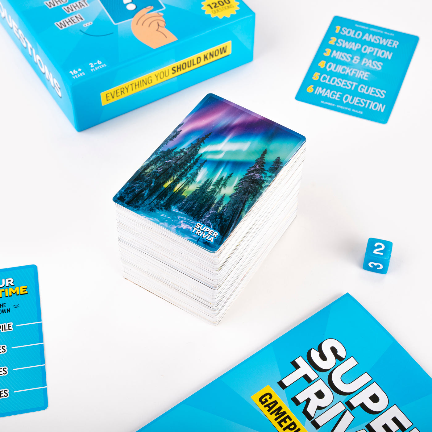 Super Trivia comes with 1200 questions and 6 different question types. A favorite for trivia buffs who can never get enough of fun facts and random knowledge!